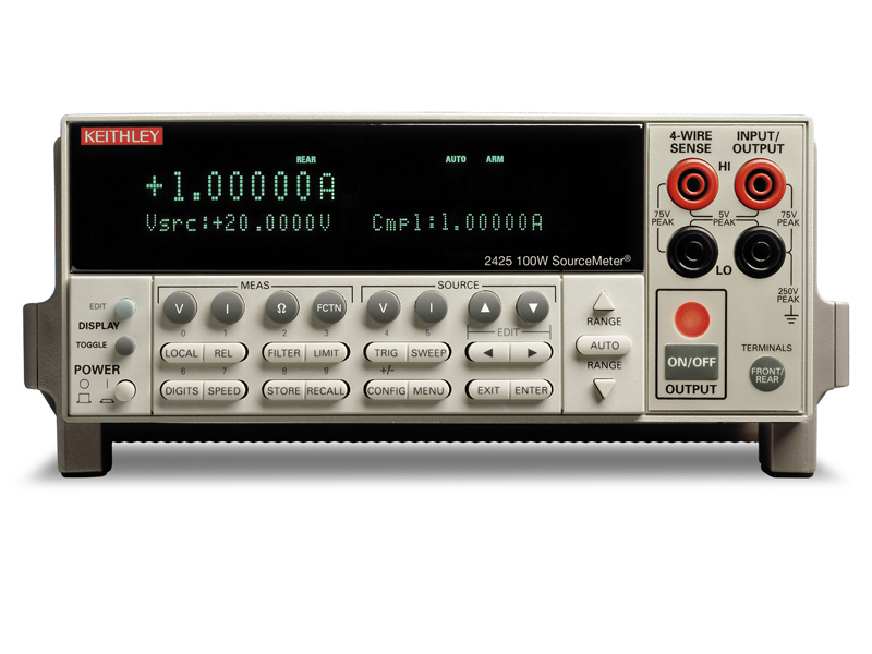 Keithley's SourceMeter family is designed specifically for test applications that demand tightly coupled sourcing and measurement. All SourceMeter models provide precision voltage and current sourcing as well as measurement capabilities. Each source-measure instrument is both a highly stable DC power source and a true instrument-grade 5-1/2 digit multimeter. The power source characteristics include low noise, precision, and readback. The multimeter capabilities include high repeatability and low noise. The result is a compact, single-channel, DC parametric tester. In operation, these instruments can act as a voltage source, a current source, a voltage meter, a current meter, and an ohmmeter. Manufacturers of components and modules for the communications, semiconductor, computer, automotive, and medical industries will find the source-measure instruments invaluable for a wide range of characterization and production test applications. The Model 2425 100W SourceMeter® extends the voltage range of the 2420 to 100V, enabling 100W capability in the 1A range. Like the Model 2420 High Current SourceMeter, it also offers a 3A range with 60W power capability. The Model 2425 was designed for production testing of medium-power devices like DC-to-DC converters, power supplies, and other components requiring between 60W and 100W of total DC power.