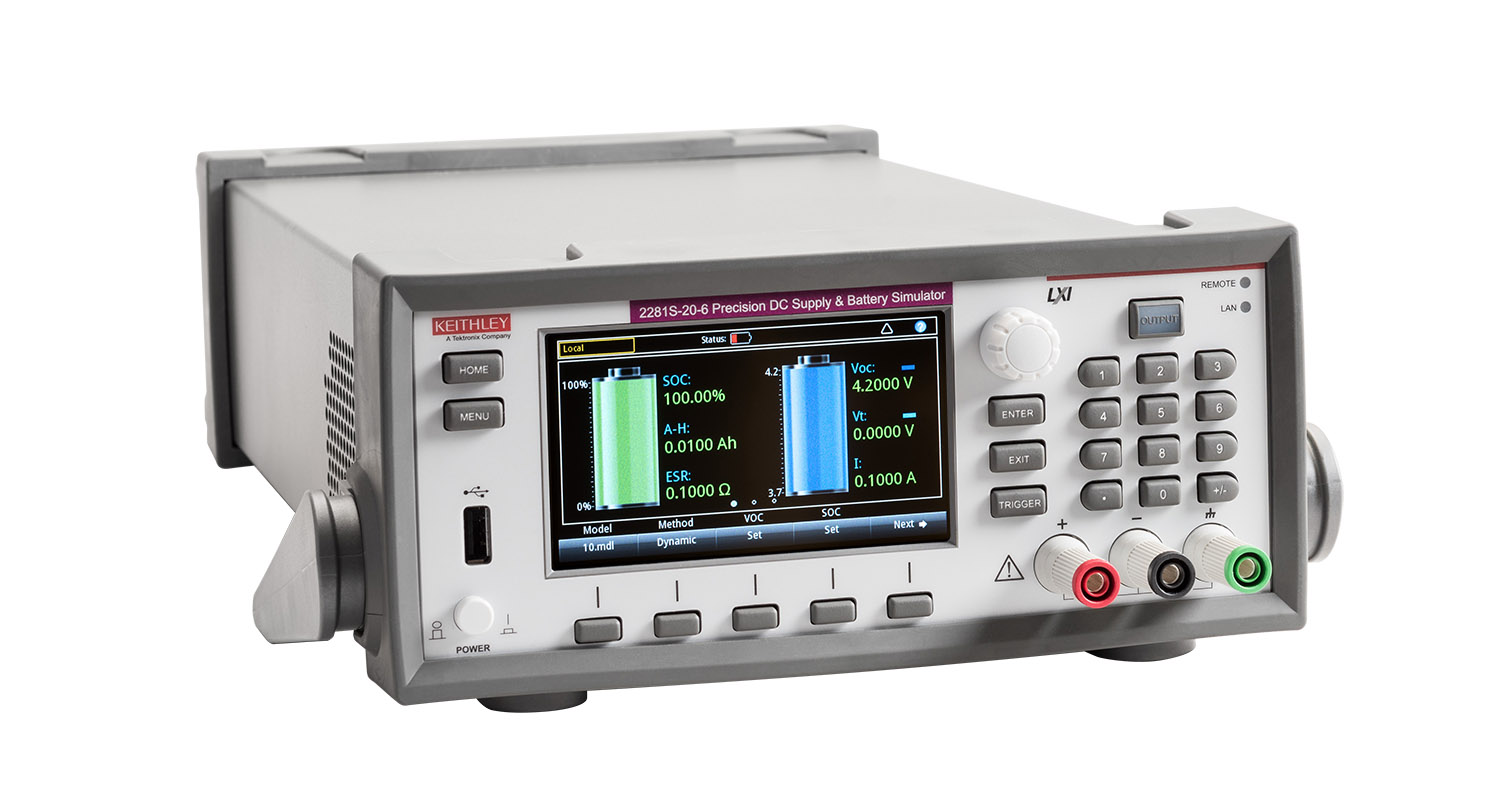 The Series 2281S Battery Simulator and Precision DC Power Supply innovatively integrates battery simulation with the functions of a high-precision power supply and battery testing. It's able to analyze the DC consumption of a device under test, test a battery, generate a battery model based on the battery charging process, and simulate a battery based on the battery model. The 2281S-20-6 can output voltage and current up to 20V and 6A and sink current up to 1A.