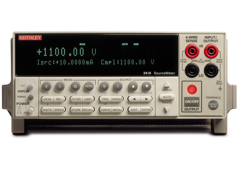 Keithley's SourceMeter family is designed specifically for test applications that demand tightly coupled sourcing and measurement. All source-measure models provide precision voltage and current sourcing as well as measurement capabilities. Each SourceMeter instrument is both a highly stable DC power supply source and a true instrument-grade 5½ digit multimeter. The power source characteristics include low noise, precision, and readback. The multimeter capabilities include high repeatability and low noise. The result is a compact, single-channel, DC parametric tester. In operation, these instruments can act as a voltage source, a current source, a voltage meter, a current meter, and an ohmmeter. Manufacturers of components and modules for the communications, semiconductor, computer, automotive, and medical industries will find the source-measure instruments invaluable for a wide range of characterization and production test applications. Our Model 2410 High Voltage SourceMeter® is a 20W instrument that sources and measures voltage from ±5µV (source) and ±1µV (measure) to ±1100V and current from ±10pA to ±1A. With its higher voltage sourcing range, the Model 2410 is an excellent choice for resistors and voltage coefficient testing, varistors, and high voltage diodes, including switching, zener, RF diodes, and rectifiers. The Model 2410 is able to measure 20mA while sourcing 1100V, providing the extra resolution needed for precision testing of these devices.
