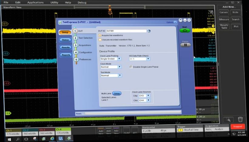 The Tektronix TekExpress® D-PHY application offers a complete physical layer test solution for transmitter conformance and characterization as defined in the MIPI D-PHY v1.2 specification. The D-PHYTX automated test solution, along with a Tektronix 6 Series MSO oscilloscope, provides an easy way to test, debug and characterize the electrical and timing measurements of D-PHY data links.