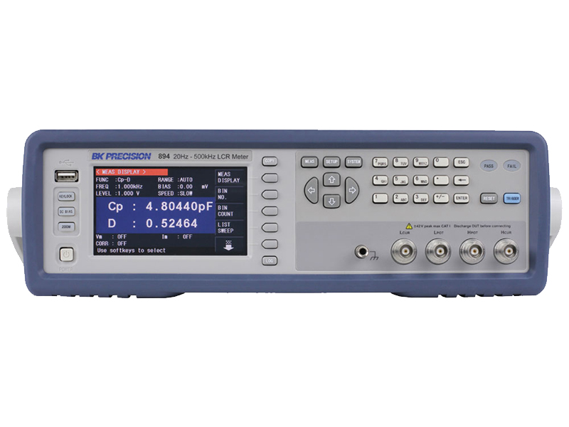 The 894 and 895 are high accuracy LCR meters capable of measuring inductance, capacitance, and resistance of components and materials at DC or from 20 Hz to 500 kHz or 1 MHz respectively. These LCR meters provide flexible AC and DC test signal configuration. AC test signal voltage is variable from 5 mVrms to 2 Vrms, the AC current is adjustable up to 66.7 mArms, depending on the AC impedance selected, and a DC bias signal can be added. The vivid 4.3-inch TFT LCD offers a clear view of all measured and setting values along with BIN sorting comparator results and a handy Zoom feature that enlarges the measured values to full screen. With a basic accuracy of 0.05%, auto level control (ALC), open / short / load correction and cable length compensation, these meter are perfect tools for R&D, manufacturing and quality control applications.