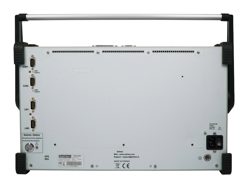 Die Datenerfassungslösung DAS1700 ist ein Hochgeschwindigkeitsrekorder, mit dem Sie mehrere Parameter erfassen können: Spannung, Strom (mit Shunt oder Clamp), Temperatur (Thermoelemente), Messungen an Sensoren (z.B. 0-10V; 4-20 mA). Sie können Ihre eigene Kanalkonfiguration einrichten, indem Sie aus den 4 verfügbaren Eingangskarten wählen: Universal-Karte, Universal-Hochspannungs-Karte, Dehnungsmessstreifen-Karte und Multiplexing-Karten. Bei geeigneter Kanalkonfiguration können Sie von 6 bis zu 72 Kanälen und 16 Logikeingängen aufzeichnen. Langzeitmessungen mit einer Abtastrate von 1 MSa/s (1 µs) sind möglich, wobei der 500 GB interne Festplattenspeicher voll ausgenutzt werden kann. Mit einer speziellen integrierten Funktion der Leistungsanalyse können Sie alle Ihre Parameter auf einem einphasigen und dreiphasigen Netzwerk (50 Hz, 400 Hz und 1 kHz) aufzeichnen. Diese Datenerfassungslösung kann über eine Ethernet- oder WiFi-Verbindung ferngesteuert werden, und die Ergebnisse können mit einer von Sefram entwickelten lizenzfreien Software analysiert werden.
