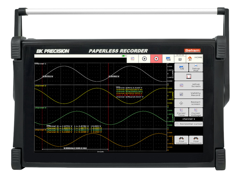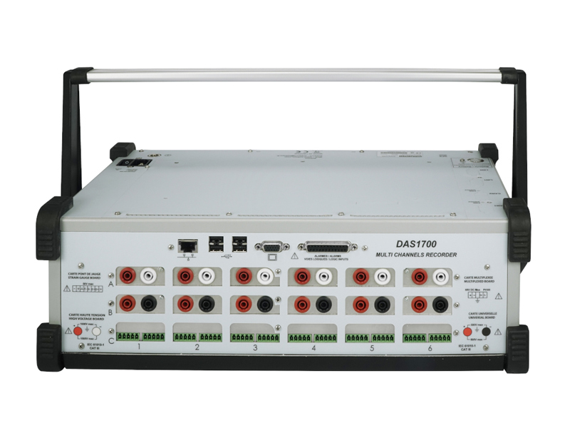 Die Datenerfassungslösung DAS1700 ist ein Hochgeschwindigkeitsrekorder, mit dem Sie mehrere Parameter erfassen können: Spannung, Strom (mit Shunt oder Clamp), Temperatur (Thermoelemente), Messungen an Sensoren (z.B. 0-10V; 4-20 mA). Sie können Ihre eigene Kanalkonfiguration einrichten, indem Sie aus den 4 verfügbaren Eingangskarten wählen: Universal-Karte, Universal-Hochspannungs-Karte, Dehnungsmessstreifen-Karte und Multiplexing-Karten. Bei geeigneter Kanalkonfiguration können Sie von 6 bis zu 72 Kanälen und 16 Logikeingängen aufzeichnen. Langzeitmessungen mit einer Abtastrate von 1 MSa/s (1 µs) sind möglich, wobei der 500 GB interne Festplattenspeicher voll ausgenutzt werden kann. Mit einer speziellen integrierten Funktion der Leistungsanalyse können Sie alle Ihre Parameter auf einem einphasigen und dreiphasigen Netzwerk (50 Hz, 400 Hz und 1 kHz) aufzeichnen. Diese Datenerfassungslösung kann über eine Ethernet- oder WiFi-Verbindung ferngesteuert werden, und die Ergebnisse können mit einer von Sefram entwickelten lizenzfreien Software analysiert werden.