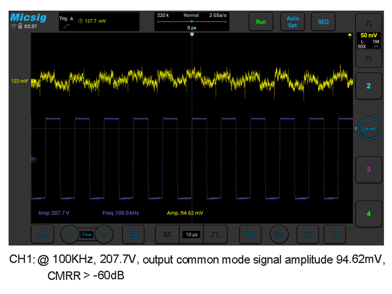 Hohe Eingangsimpedanz und niedrige Eingangskapazität, minimierter Lasteffekt, stark verbesserte Genauigkeit des Differenzsignals. Hohe Gleichtaktunterdrückung, in der Lage, schwebende Messungen von großen Gleichtaktspannungen bei hohen Frequenzen zu erfüllen.