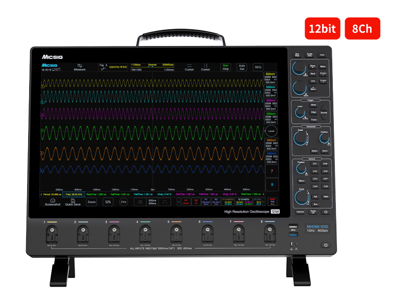Ausgestattet mit 8 unabhängigen analogen Kanälen, ermöglichen die Oszilloskope der MHO 6-Serie Ingenieuren die gleichzeitige Beobachtung und Analyse von bis zu 8 Testpunkten, was die Testeffizienz und -genauigkeit erheblich steigert. Dadurch wird die Timing-Analyse, die Fehlersuche und die Leistungsoptimierung komplexer Systeme erheblich unterstützt.