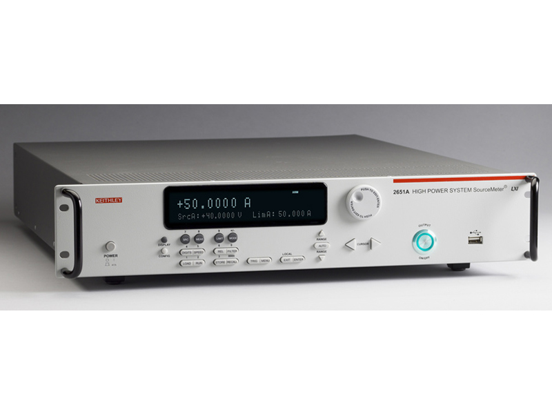 The Model 2651A High Power System SourceMeter® Instrument is designed to characterize and test high current and high power electronics. The wide dynamic range (50A, 40V, 100fA) of this SMU instrument can help you improve productivity in applications across the R&D, reliability, and production spectrums. Through the TSP-Link interface and embedded "Plug & Play" web software, the model 2651A can be combined with another 2651A to increase the maximum current range to 100A, with other Series 2600B SourceMeters to create SMU-per-pin test systems, or with the Model 2657A to create high power test systems capable of 3000V and 100A. Optional test fixtures and system-level accessories are also available.