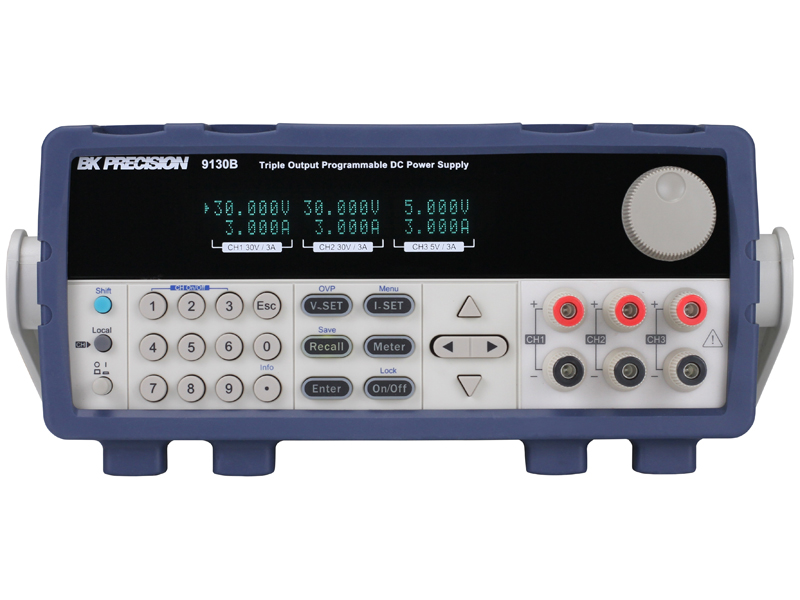 The 9130B Series triple output linear programmable DC power supplies feature isolated outputs that can be adjusted independently or combined in series or parallel to output higher voltage or current. Additionally, these supplies can operate in tracking mode with user-configurable ratios between channels. The front panel keys and rotary knob with convenient cursors let users quickly set voltage and current values.