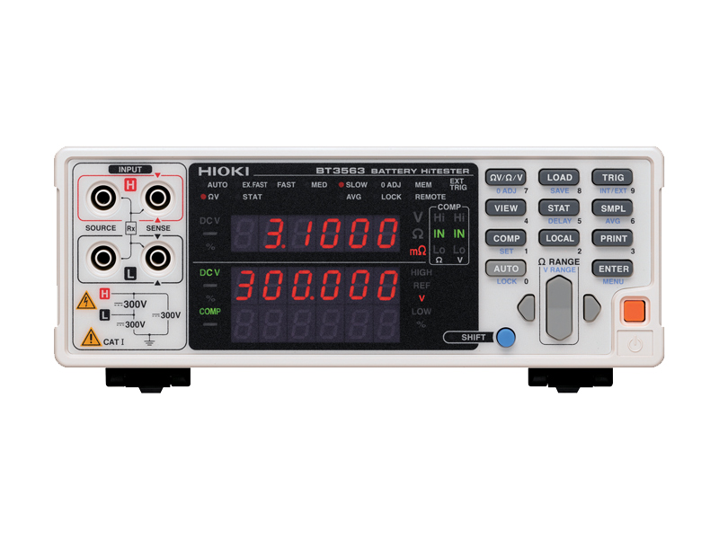 Hioki benchtop battery testers support simultaneous high-speed measurement of internal resistance and battery voltage for the ever-expanding production lines of increasingly larger lithium-ion low resistance batteries, and other battery packs for high voltage applications. The BT3563 battery internal resistance tester can measure the voltage and resistance of battery modules, high voltage battery packs, fuel cell stacks and other large batteries up to 300V.