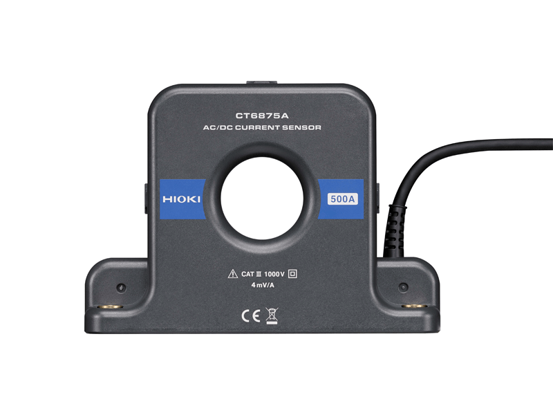 Hioki's pass-through type AC/DC current sensors can be connected directly to Hioki Power Analyzers and Memory HiCorders. Also, it can be connected to Power Meters, Oscilloscopes, DMMs, etc. by using an optional sensor unit. The CT6875A has a frequency bandwidth of DC to 2 MHz (Model CT6875A-1 is DC to 1.5 MHz) and a rated current of 500 A. It is used for R&D, quality evaluation, manufacturing, and maintenance in markets such as wireless charging systems, inverter motors for industrial equipment, power conditioners for PV, and quick charging facilities for EVs. Use with an instrument with a high input impedance of 1 MΩ or higher.