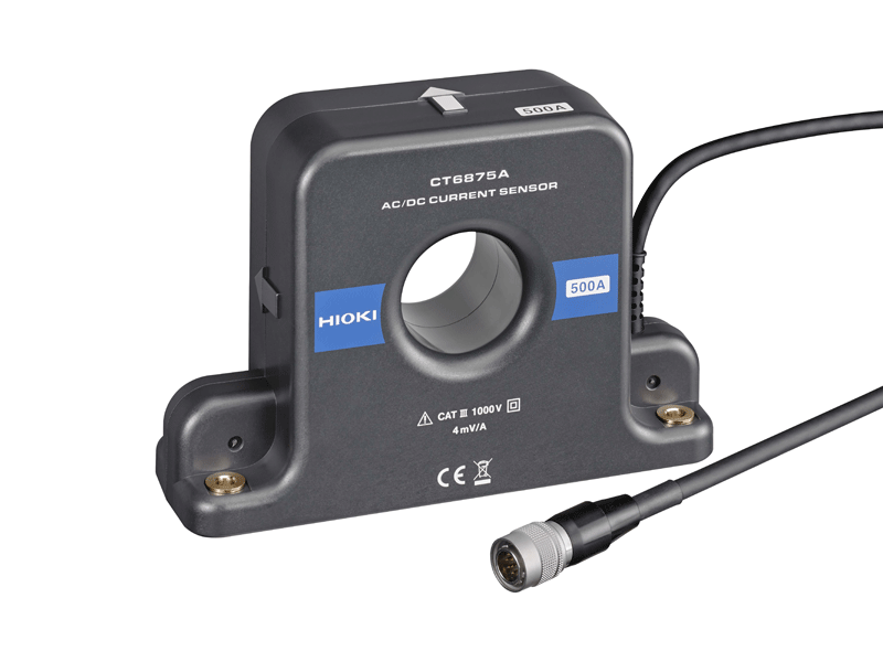 Hioki's pass-through type AC/DC current sensors can be connected directly to Hioki Power Analyzers and Memory HiCorders. Also, it can be connected to Power Meters, Oscilloscopes, DMMs, etc. by using an optional sensor unit. The CT6875A has a frequency bandwidth of DC to 2 MHz (Model CT6875A-1 is DC to 1.5 MHz) and a rated current of 500 A. It is used for R&D, quality evaluation, manufacturing, and maintenance in markets such as wireless charging systems, inverter motors for industrial equipment, power conditioners for PV, and quick charging facilities for EVs. Use with an instrument with a high input impedance of 1 MΩ or higher.