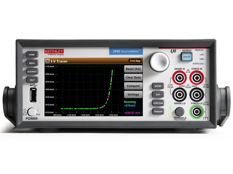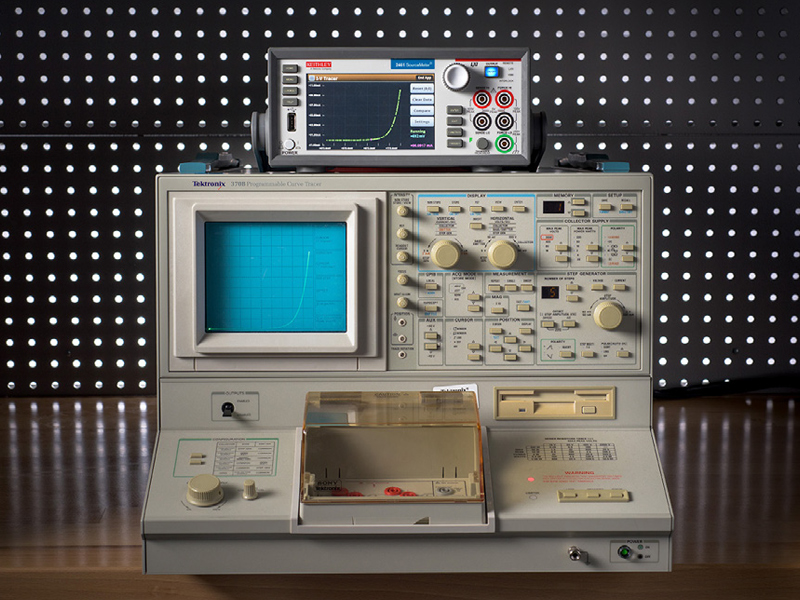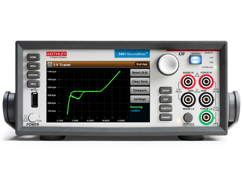 Keithley’s I-V curve tracer software leverages the unique touchscreen interface of the graphical 2400 Series SourceMeter® Source Measure Unit (SMU) instruments to recreate the familiar user experience of an I-V curve tracer for two-terminal devices. Adding the I-V curve tracer software to your SourceMeter instrument gives you a dedicated user interface for tracing the characteristics of your devices through both current and voltage. With a range of compatible instruments, I-V Tracer can utilize the full capabilities of each source measure unit, including the dual high-speed digitizers of the 2461 to perform tracing with AC polarity and pulsed DC, in addition to standard DC polarity. Though I-V Tracer will allow engineers to perform failure analysis and parametric characterization of diodes, more advanced I-V curve tracer configurations are required to test MOSFETS, IGBTs, and other high-power devices.