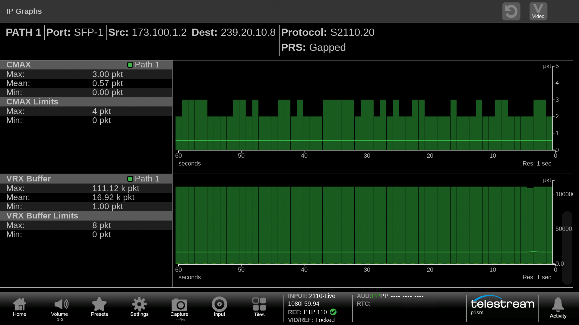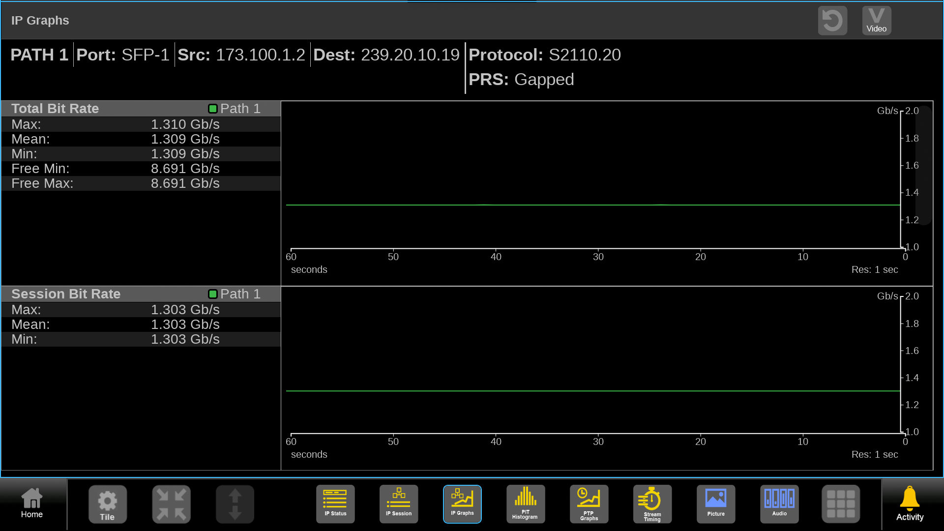 IP Graphs allows for metrics of the IP stream to be plotted from 60 seconds to 24 hours. This allows the user to track the