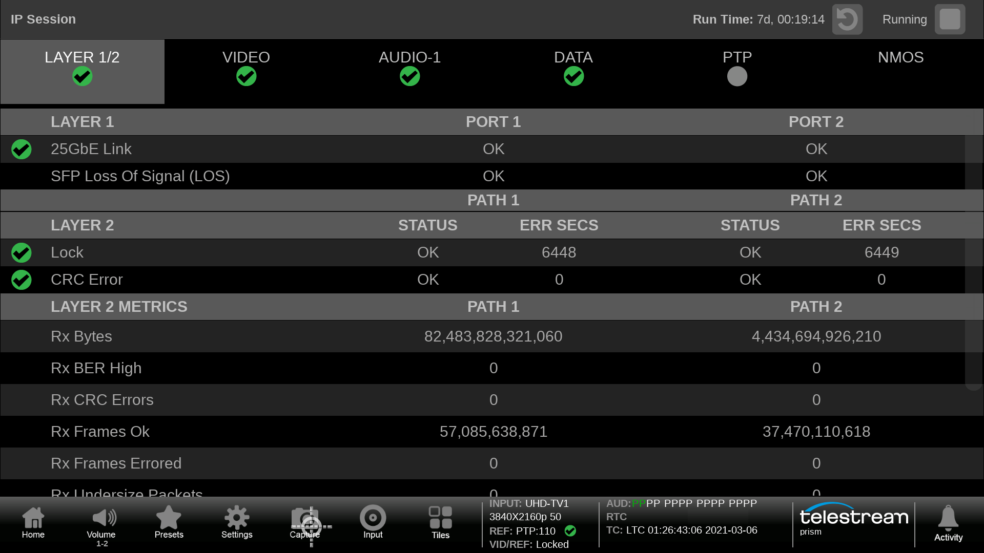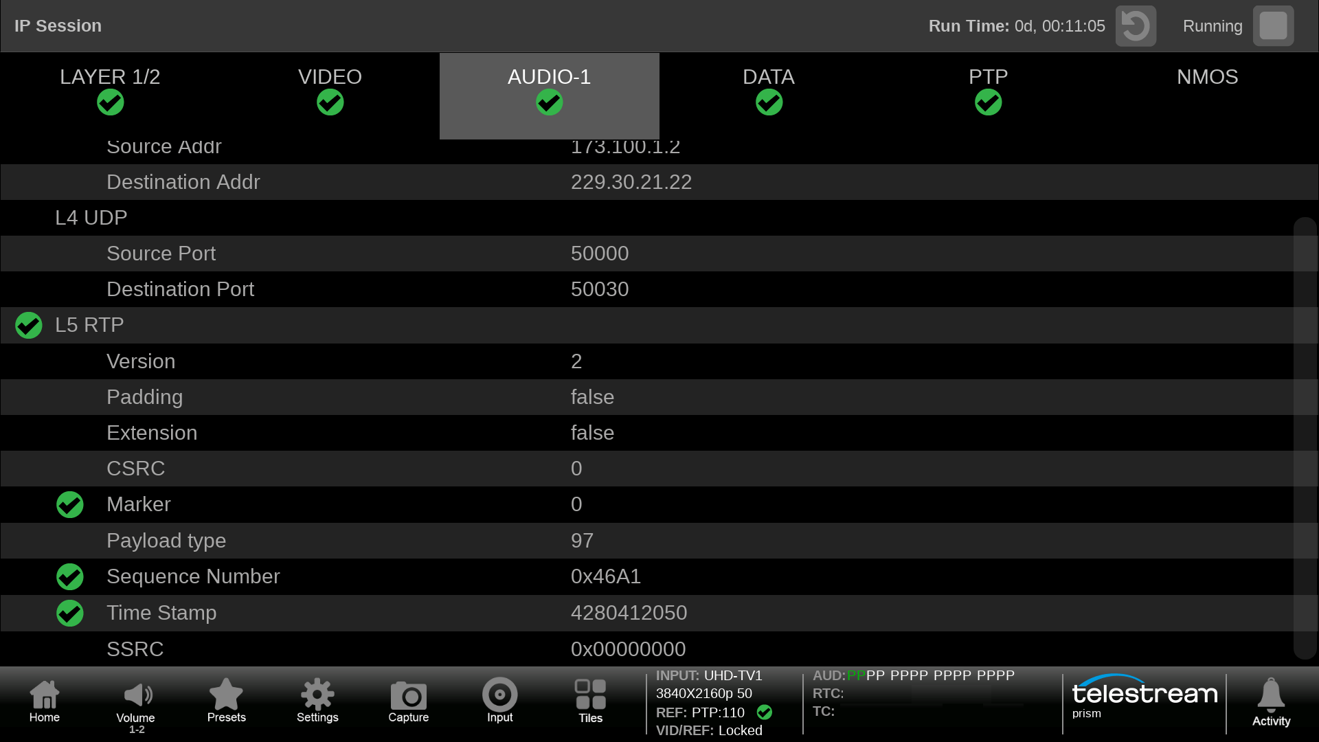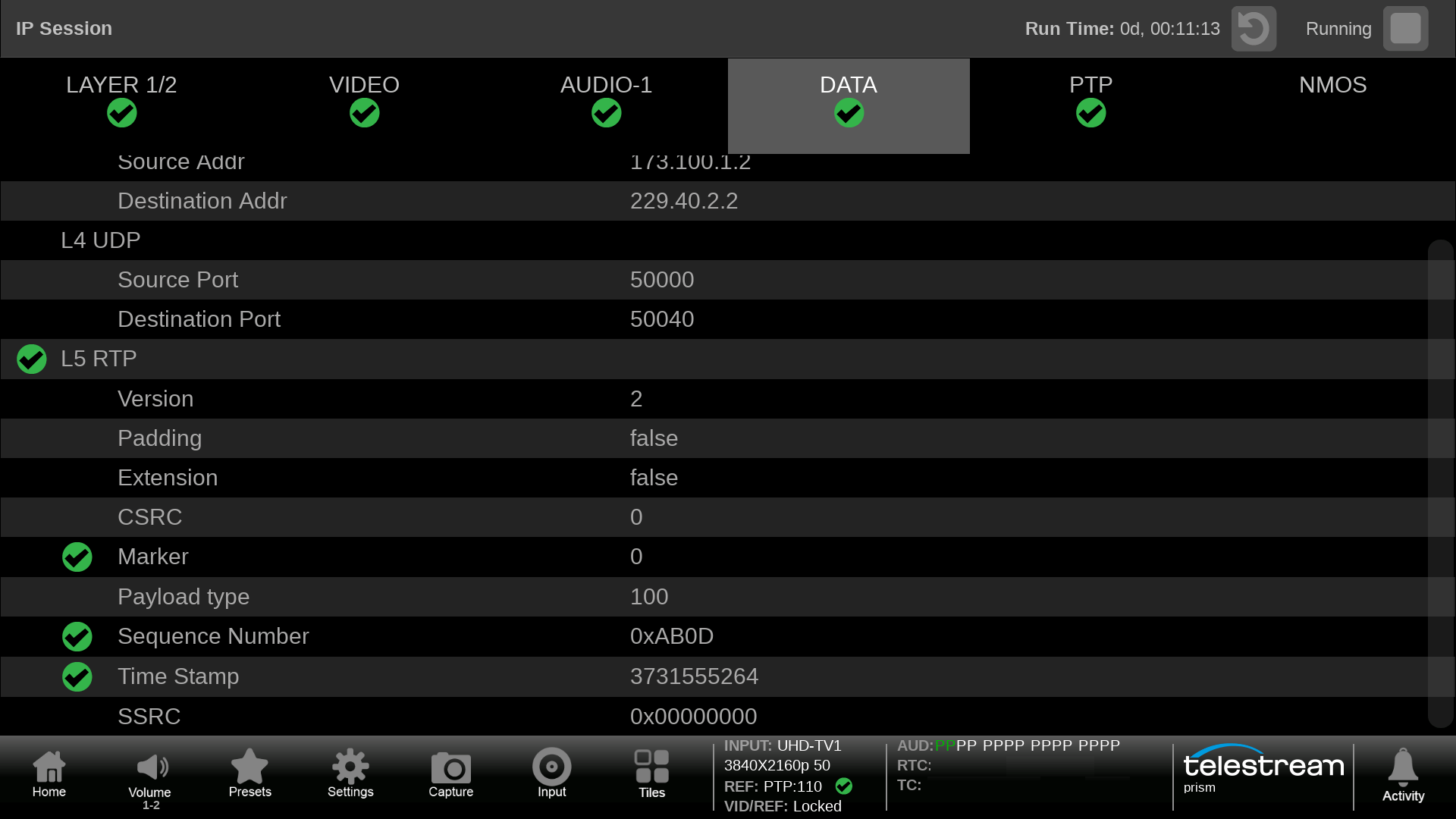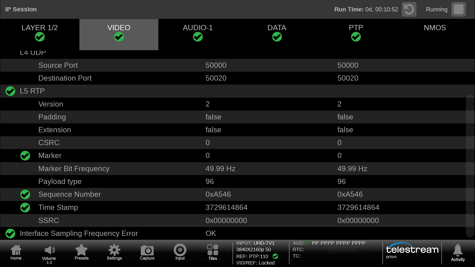 IP Session shows information for Layer 1 & 2, Video, Audio, Data, PTP and NMOS. The user can verify data streams and check syntax information.