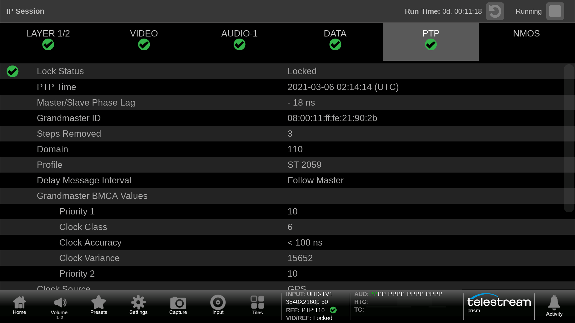 stream is locked to PTP and to track the variations across the network of the stream by PRISM for video, audio and data.