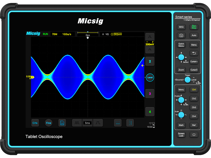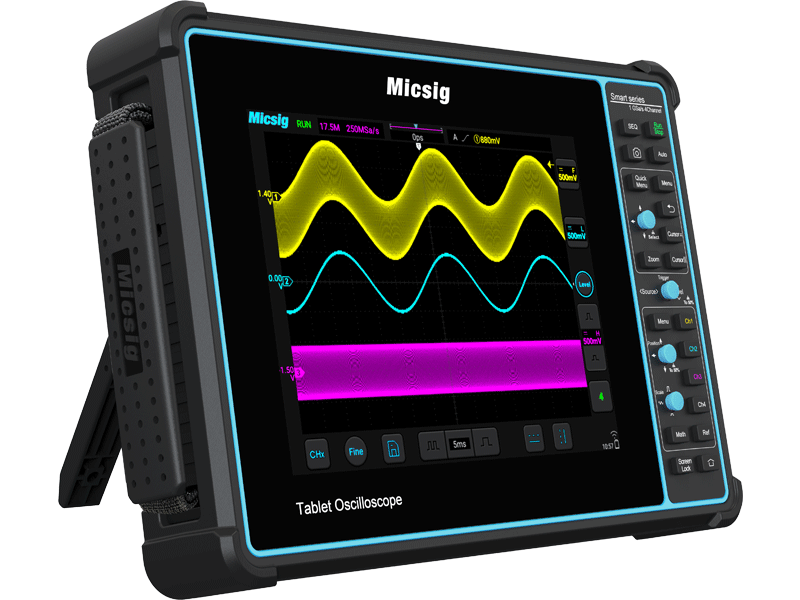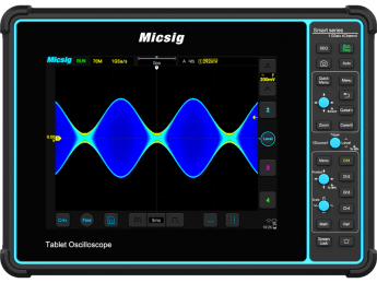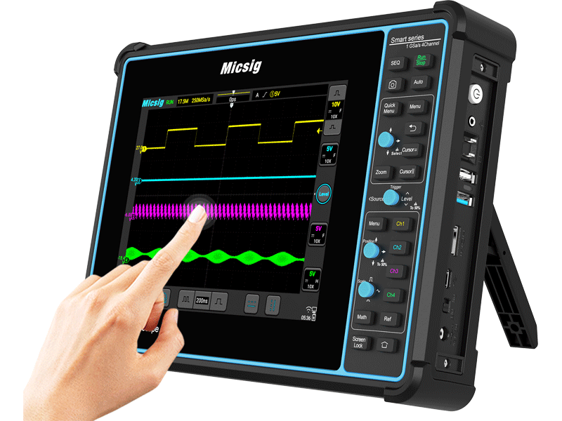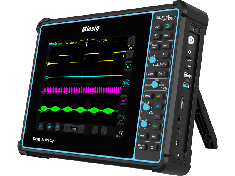 The new Micsig STO1004 series combines innovative touch operation with conventional knobs for even greater ease of use. Compared to the STO1000E, the new STO1004 offers even more performance with 70M sample memory and 130'000 wfm/s. The STO series is based on a new Android operating system and is built like a modern smartphone. Apps can be loaded directly onto the device from the manufacturer. With the LAN, WLAN and USB interfaces, the device is ideally connected to the world and it can be easily controlled remotely with the supplied software. The standard HDMI output is suitable for live streaming to a beamer, for example. With the large battery capacity and the robust design, the device is also ideally suited for use in the field.
