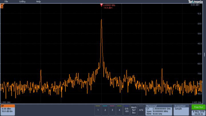 the spectrum analyzer standard N-connector input, the 3 Series MDO display becomes a full-screen Spectrum Analyzer view. Key spectral parameters such as Center Frequency, Span, Reference