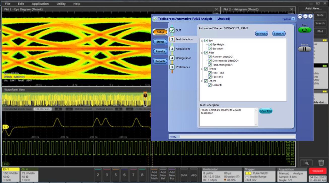 For Automotive Ethernet designing, testing, and debugging, Tektronix offers the comprehensive PAM3 Signal Analysis, Signal Quality test, and Protocol Decode testing solution.