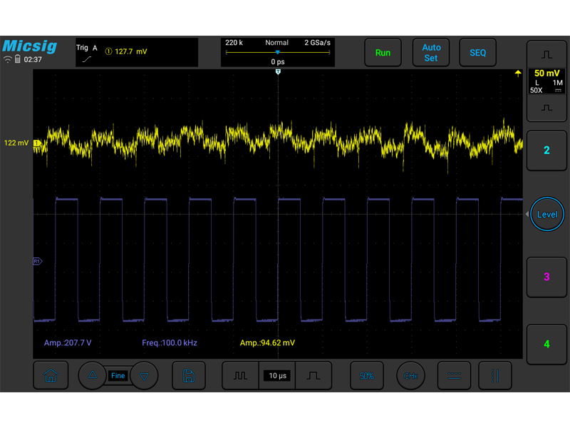 CH1: @ 100KHz, 207.7V, output common mode signal amplitude 94.62mV, CMRR > -60dB