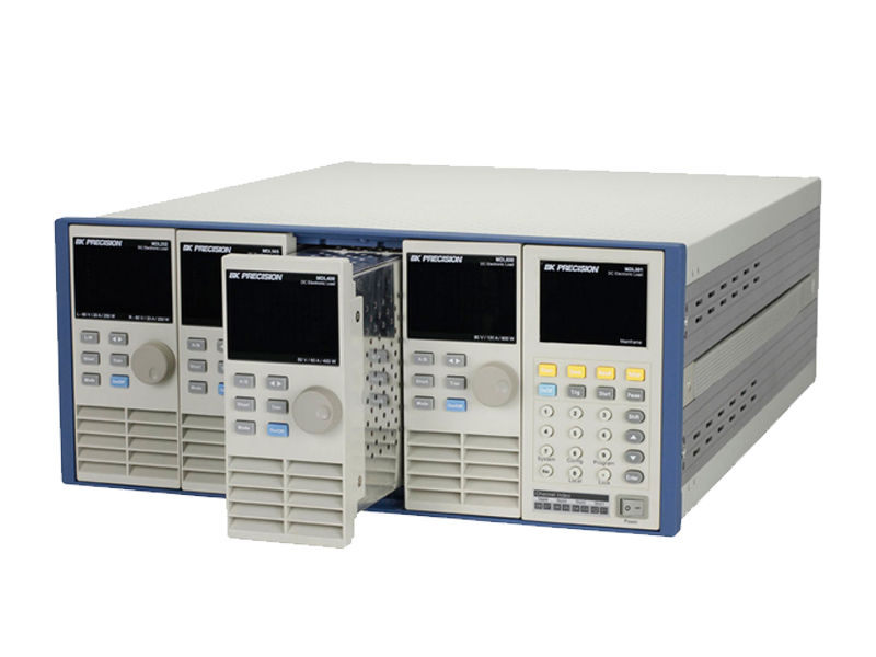 La série MDL est un système de charges électroniques modulaire. Sous forme d'un rack, le MDL001 permet d'accueillir jusqu'à 4 modules offrant des puissances unitaires de 200 W à 600 W et une grande variété de tensions et de courants. Ce système est idéal pour les applications de type: test d'alimentations muli-voies, test de cellules photovoltaiques, test de batteries, etc... Le MDL001 permet de recevoir tous les modules de la gamme, permettant ainsi d'avoir une puissance de 2400 W (et jusqu'à 4800 W avec le module d''extension MDL002). Tous les modules peuvent fonctionner en mode courant constant (CC), tension constante (CV), résistance constante (CR), puissance constante (CW), et impédance constante (CZ) . Ce dernier mode uitilise un DSP pour simuler le comportement de dispositifs non résistifs.
