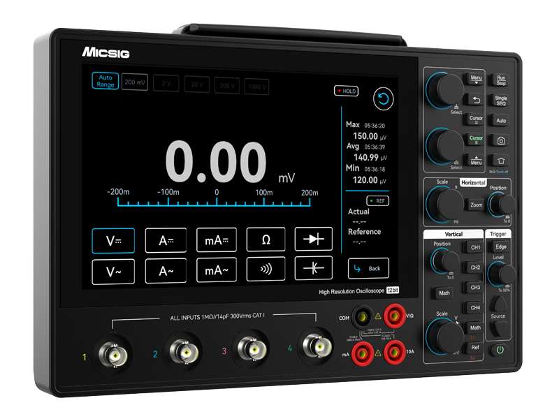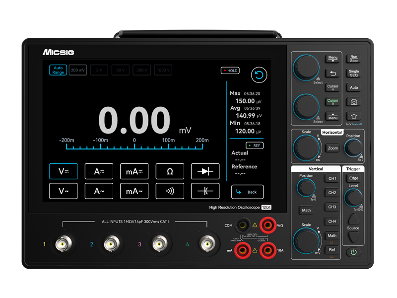Micsig MHO1 series is an ultra-portable professional-grade high-resolution oscilloscope, equipped with a 12-bit high-precision ADC, featuring a bandwidth of up to 200MHz, 4 analog channels, a real-time sampling rate of 1GSa/s, and a storage depth of 110Mpts. These high-performance parameters ensure that every measurement is accurate and provides a solid foundation for in-depth signal analysis. With a body thickness of only 3.1 cm, it can be easily placed in a backpack for efficient testing anytime, anywhere. It is equipped with an 8-inch high-definition anti-glare touch screen with a resolution of up to 1280*800, offering a delicate and clear picture and responsive touch, bringing users an ultimate operating experience.
