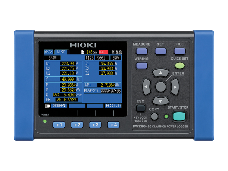 HIOKI Clamp On Power Meters are multi-channel power measuring devices utilizing clamp sensor input to accurately and safely measure power on single-phase to three-phase lines. The PW3360 compact 3-Phase 4-Wire energy loggers monitor power demand and other power parameters to aid in energy audits and validate energy saving measures.